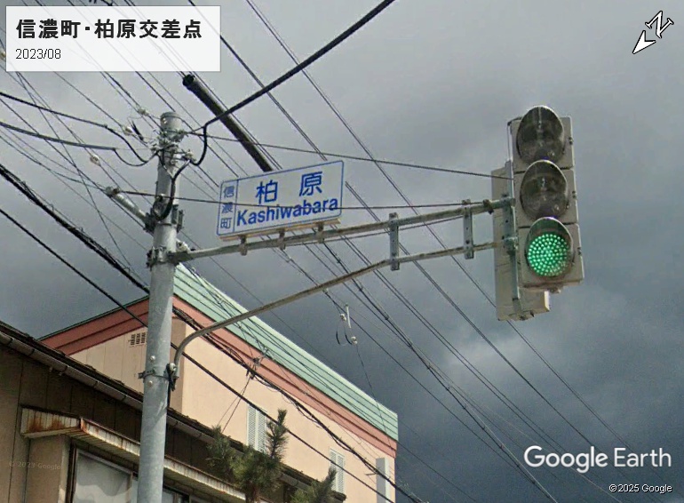 次の茅野市北山柏原が問題です。郵便番号検索ではヒットしません。交差点標識は「Kashiwahara」で清音です。2018年8月撮影のストビューを埋め込みました。この信号機は2023年4月撮影のストビューでは撤去されています。