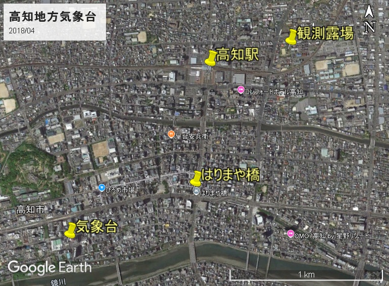 千葉ほどの高さは必要ないかもしれませんが、風速計に関してはある程度の高さが必要になるはずです。露場が見当たらないことを不思議に思っていたら、観測露場の所在地が「高知市比島町」になっていました。