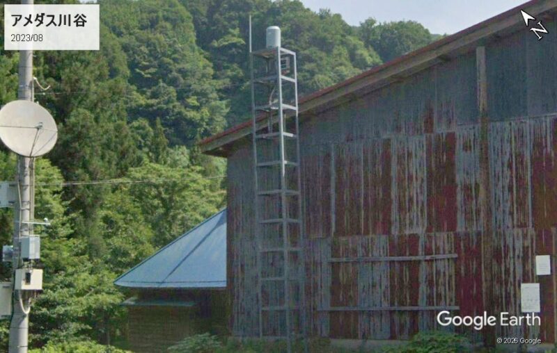 川谷の雨量計はストビューで確認することができます。11段の櫓の上に雨量計が設置されています。冬場の積雪に埋もれない高さが確保されているものと思われます。1段1尺間隔の梯子より広そうですので、地盤面から4~5mの高さになるのでしょう。