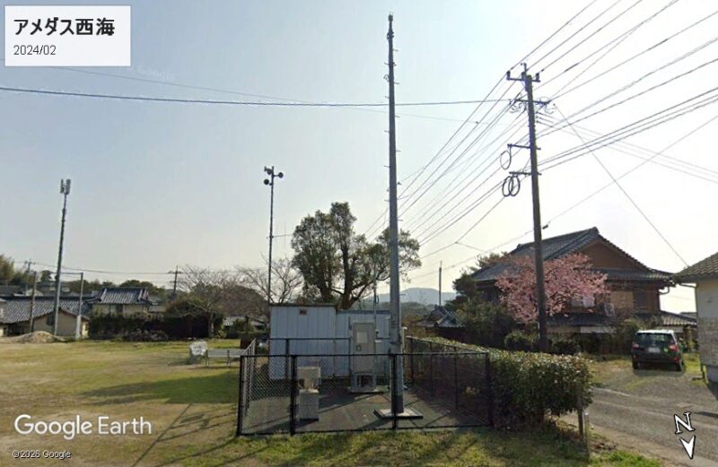 【2026/03/09追記】アメダス西海のストリートビューが追加されていました。Googleマップではなぜか「西浦地域気象観測所」と誤って表示されますけど…。