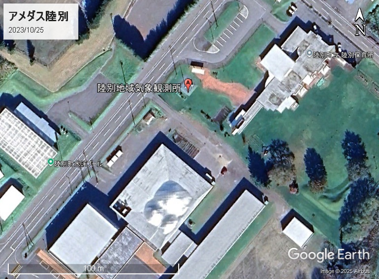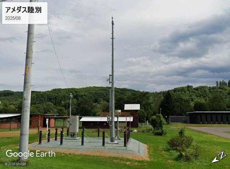 ストリートビューが追加されていました。ストビューは2025年8月撮影分です。気温計の高さは標準1.5m、風速計は10mとして公表されています。アメダス陸別の最大積雪深は2004年2月の125センチですので、1.5mでも足りるということのようです。