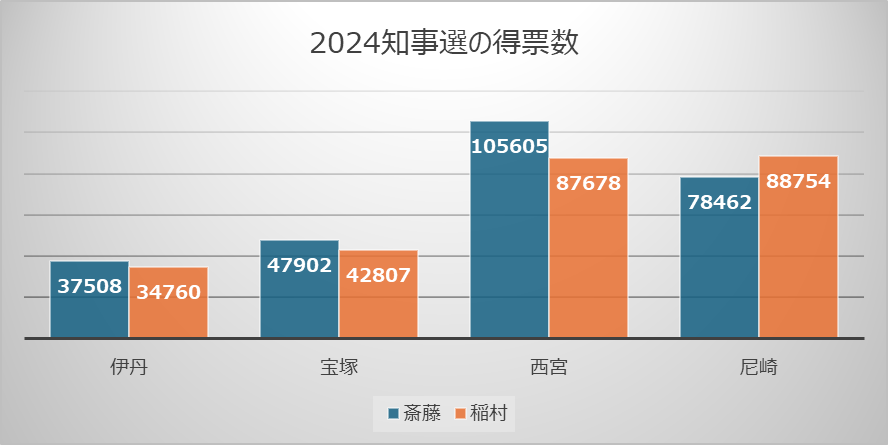 宝塚では2009年2月に現職市長が収賄容疑で逮捕され(8日後に辞職)、4期16年の2代に渡って野党系の女性市長が続いていました。共産党も乗っかった形の共闘です。とはいえ、2024知事選では稲村氏の得票に共産票を足しても斎藤氏の得票には及びません。
