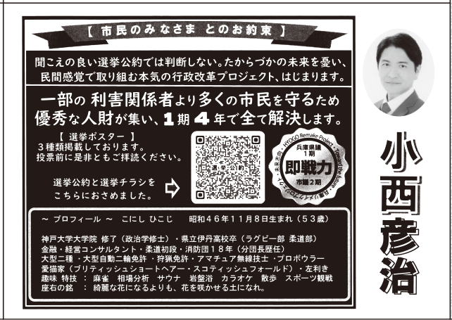 小西氏は2019年には伊丹市議選で2度目の当選を果たします。維新を除名されたのはこの年のようです。2023年秋から無投票が有力視される首長選挙への出馬を繰り返しており、昨年1月から2月にかけて5週連続落選の快記録を樹立しています。
