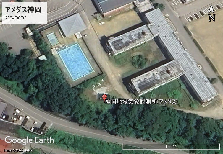 アメダス神岡の航空写真です。神岡東小学校の学校内立地でしたが、町村合併直後の2005年に3校が統合して廃校になっています。校舎と体育館は20年間そのままです。プールは市民プールとして利用されています。