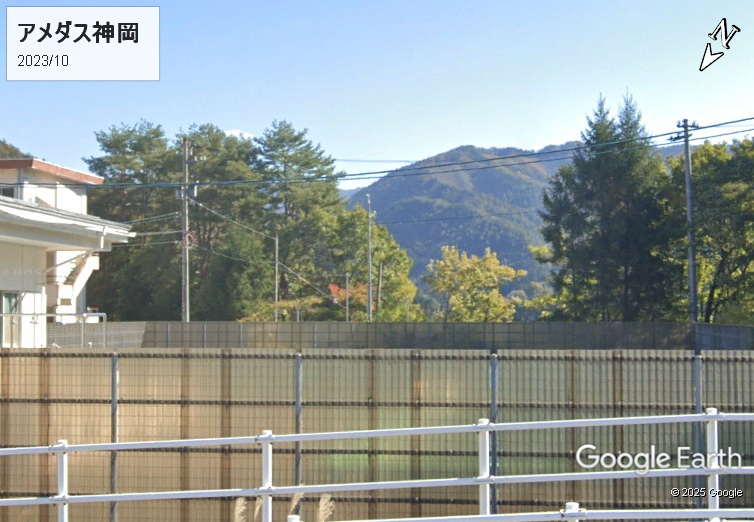 標高は455mとされています。このエリアだけで考えるならアメダス神岡は南斜面の立地です。気温観測開始後の移転はありません。風速計は高さ10m、温度計は高さ2mです。雨量計も2m以上だと思われますが、確認できません。最大積雪深は2006年の166センチです。