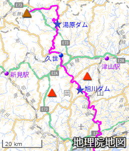地図の赤▲は標高600m台の山です。南や南東の風でも久世では吹き下ろしになってしまうようです。旭川は蒜山高原から岡山市街を抜けて児島湾に注ぎます。