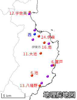 紫マーカーは伊豆急の駅(北から2つ目が伊東駅、最南が伊豆高原駅)、赤マーカーは小学校とその学級数、青は2年前に廃校となり図書館移転先候補の西小学校跡地です。田久保氏は富戸(ふと)です。