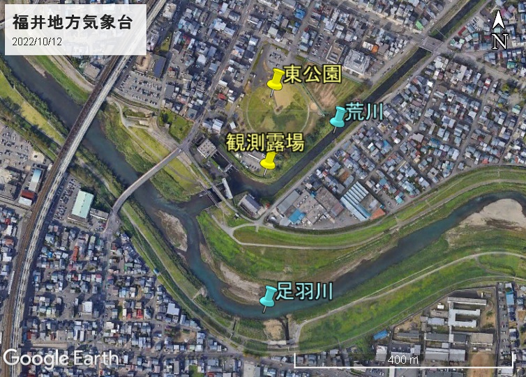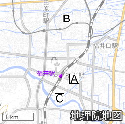 省略があるのかもしれませんが、ABCを地図に落とし込むと次のようになります。標高は3地点ともそんなに変わりません(せいぜい1m程度)が、福井の最高気温がなかなか更新されないのは移転の影響と思われます。