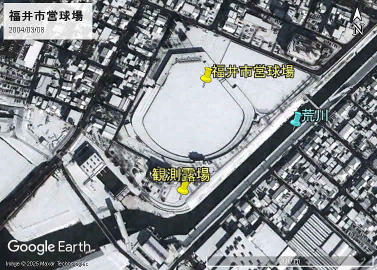 東公園はもともと福井市営球場でした。2004年3月撮影の積雪時の航空写真が見つかりました。2008年に解体されていますが、1950年代にはプロ野球の試合も20試合以上開催されています。外野は天然芝です。