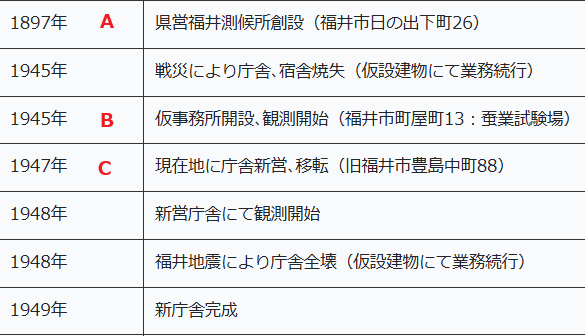 福井地方気象台は1897年開設です。1945年7月19日の空襲で庁舎が被災焼失して2か月以上観測は中断しています。1948年6月28日午後4時13分の福井地震では、新築木造庁舎が倒壊したものの火は回らずに済んだようで観測は継続されています。