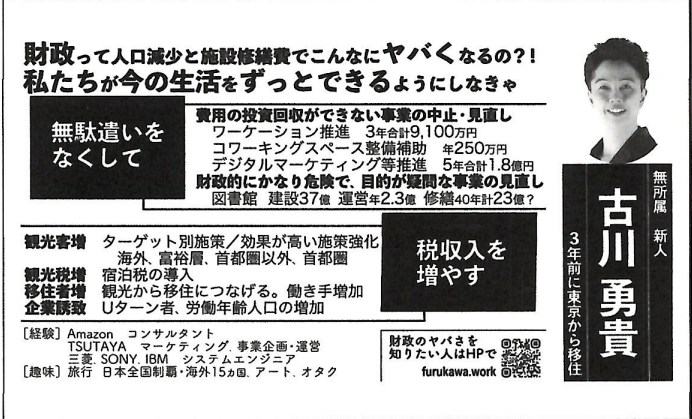 2023年9月の伊東市議選は30人の立候補者が20の議席を争いました。得票数188票で30位落選だったのが古川勇貴氏です。当時の選挙公報です。