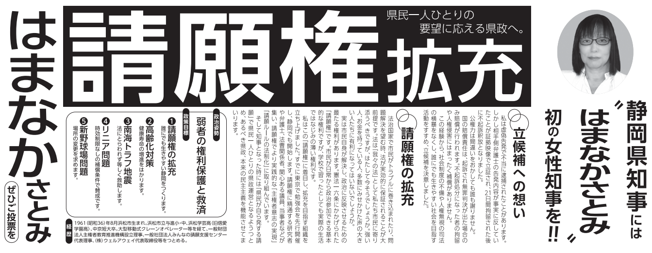 公報に「勝手に書かれた」という事実はまずあり得ません。静岡県選管はこの記事に訂正を求めるべきです。選挙公報の原稿は選管に提出するものであり、マスコミが求める調査票とは別物です。浜中氏の出馬歴は2024年の静岡県知事選1回きりです。