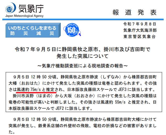 9月5日に牧之原で発生した突風は現地調査の結果、推定風速が約75m/sの竜巻だったとされています。