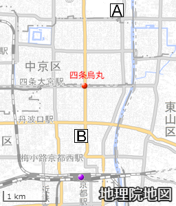 鴨長明が記述した「辻風」は、今の京都御所(A)付近で発生して東本願寺(B)付近で消滅したようです。北半球で発生した竜巻は東寄りの北に移動することが多いはずですが、この「辻風」は南南西に動いています。