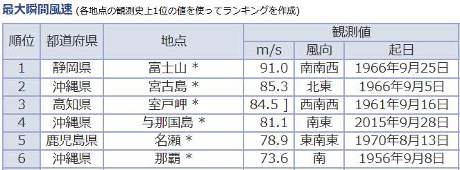 75m/sは国内最大瞬間風速ランキングの6位相当です。日本の地上気象観測における風速は0.25秒ごとに観測されており、ここに言う最大瞬間風速とは3秒間12サンプルの平均値(最大風速は10分間の平均値)です。