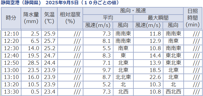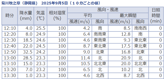 12時50分前後の両アメダスの観測値は次のとおりです。