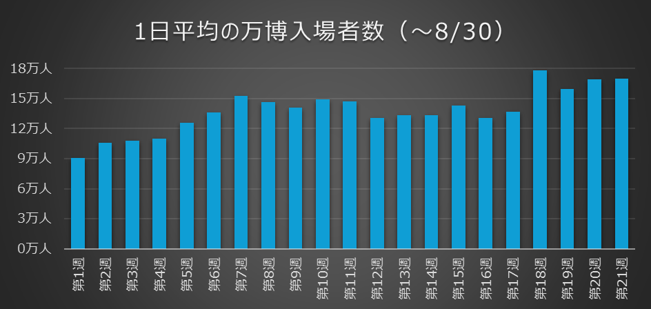 初期想定2820万人を会期の184日で割れば、1日当たり15万3216人です。これを残り期間に掛け算のうえ加算した数値が2595万人です。ここまでは比較的容易にクリアできるものと思われます。