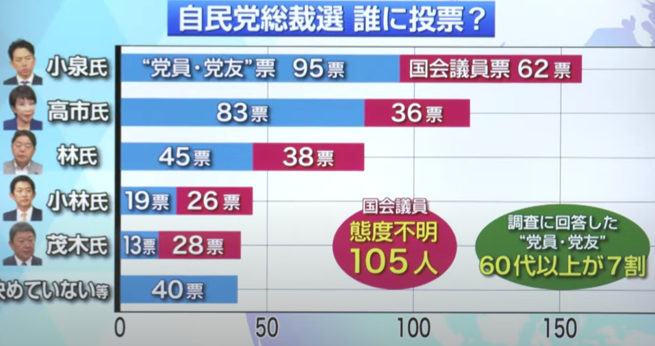 決選投票が小泉vs高市になろうと高市vs林になろうと、決選投票では小泉+林連合が成立するわけですから、もはや勝ち目はありません。前々回1回目の高市氏は188票で3位、前回1回目は181票で1位でした。上のNNNによれば、高市氏が今回固めているのは119票です。