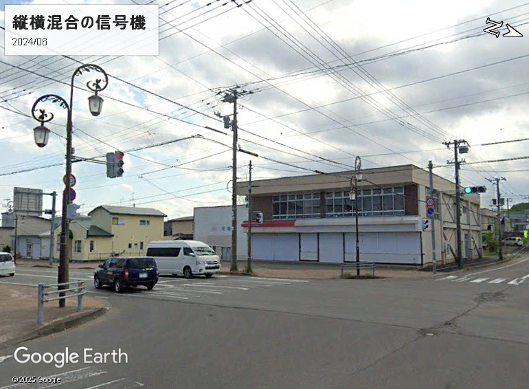 標茶駅からの駅前中央通で釧路川を渡ると、信号機がタテ・ヨコ混合の交差点があります。