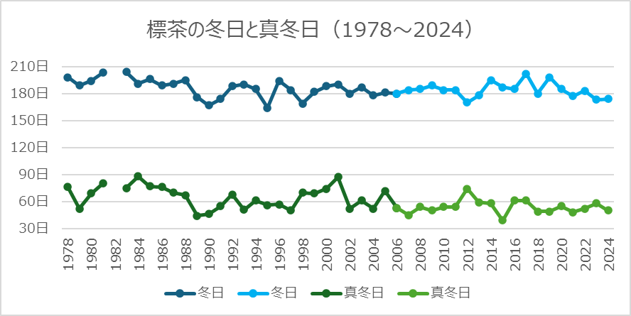 冬日や真冬日は若干少なくなっていますが、それほど顕著なものでもありません。