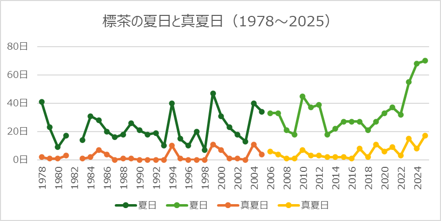 今年の夏日は70日、真夏日は17日でそれぞれ過去最多でした。熱帯夜はまだありません。