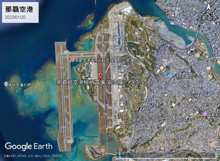幸いにもGoogleマップでは「那覇航空測候所露場(安次嶺アメダス)」がヒットします。第1滑走路の中ほどに露場は設置されているようです。空港内のストビューはありませんので、これを信じるしかありません。