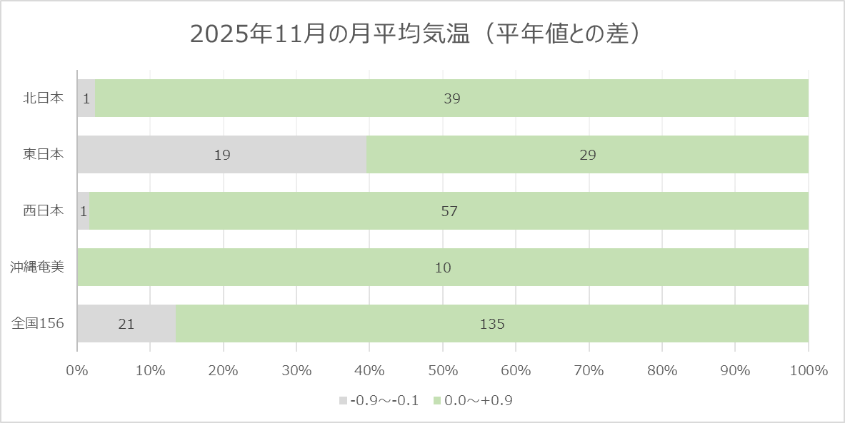 この156地点の2025年11月平均気温は、去年11月より1.1℃低く平年値(1991~2020年の平均)より0.2℃高い11.9℃でした。