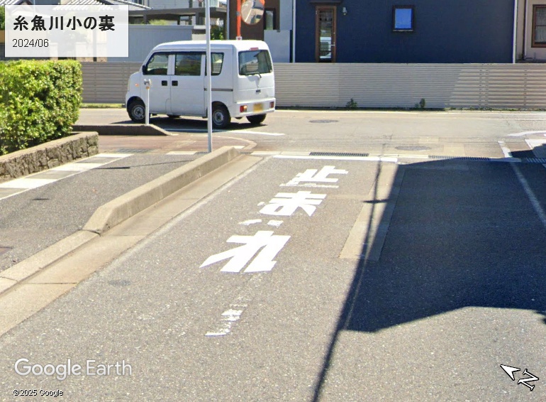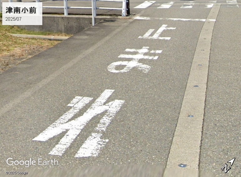 新潟の路面標示「止まれ」は大阪タイプです。津南町立津南小学校は、アメダス津南とは直線距離3.5キロ、標高差200mほどです。次のストビュー画像は県道117号に突き当たる融雪装置付き道路の「止まれ」標示です。