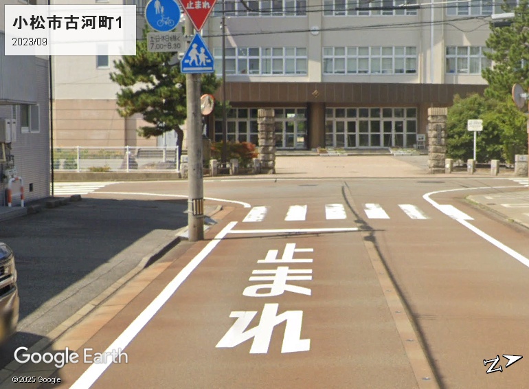 小松市の市街地にも消雪パイプが敷設されており路面は変色しています。石川も富山同様に「止まれ」標示は少なめです。