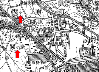 これ(↑)は単純なミスなのでしょうが、1990年代に発行された2万5000分の1の地形図(↓)では「関ヶ原町」です。地図業界?では「ヶ」は前の文字の付属物という扱いを受けていましたので、こうした表記になります。