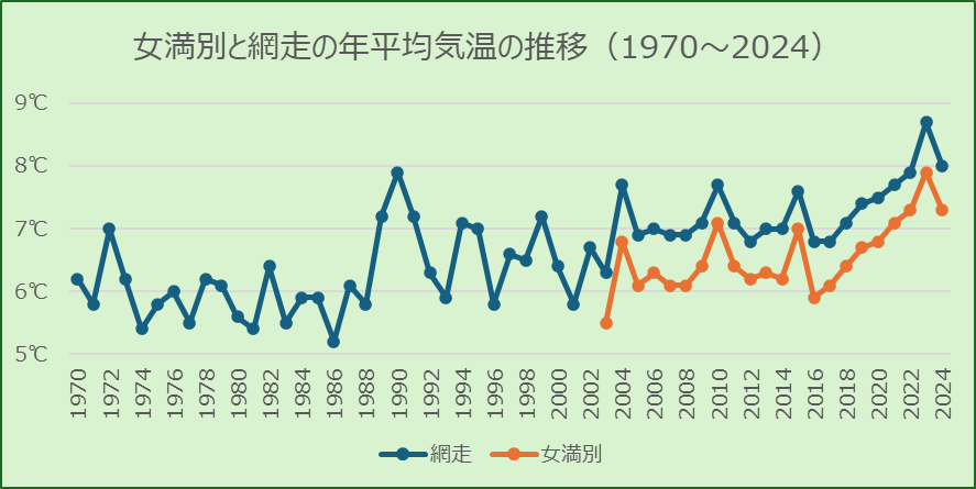 アメダス女満別の標高は33m、最大積雪深は2015年3月5日の72センチです。網走気象台とは17キロ以上離れていて、より内陸のアメダス美幌とは13キロ近くの直線距離があります。年平均気温を網走と比較してみました。