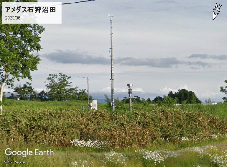 アメダス石狩沼田のストビュー画像です。2023年6月撮影のものです。結構な高さに雨量計が設置されていますが、気温計の通風筒は中央の風速計の根元付近(茂みの少し上)です。