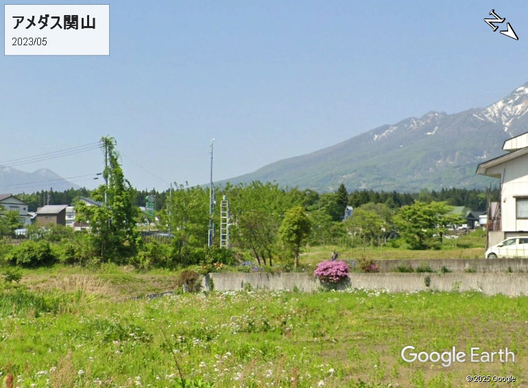 アメダス関山は関山駅の西側です。1975年の設置当時は妙高村関山であり、今は妙高市関山ですから、自治体名をアメダス名称としてもいいはずですが、当時も今も関山です。