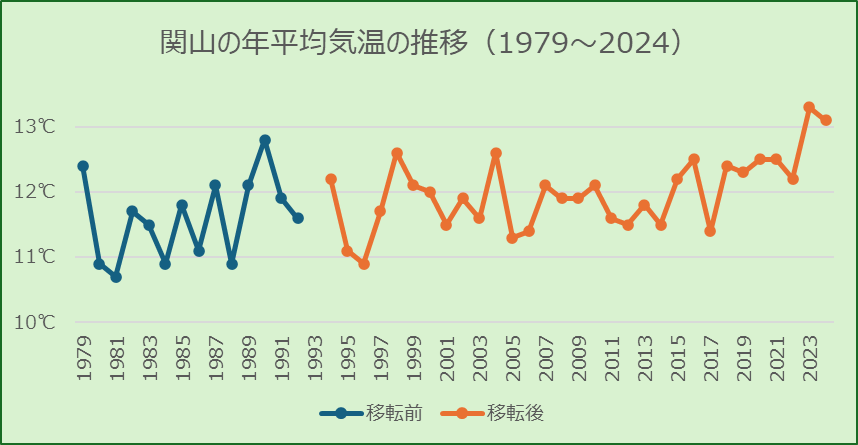 年平均気温は次のように推移しています。他地点より傾斜が緩やかですので、15mの標高差が影響しているのかもしれません。