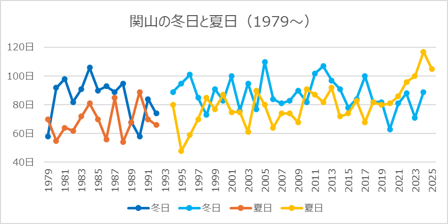 冬日と夏日の比較です。冬日優勢でしたが、2020年以降は夏日の6連勝(今年も確定)です。