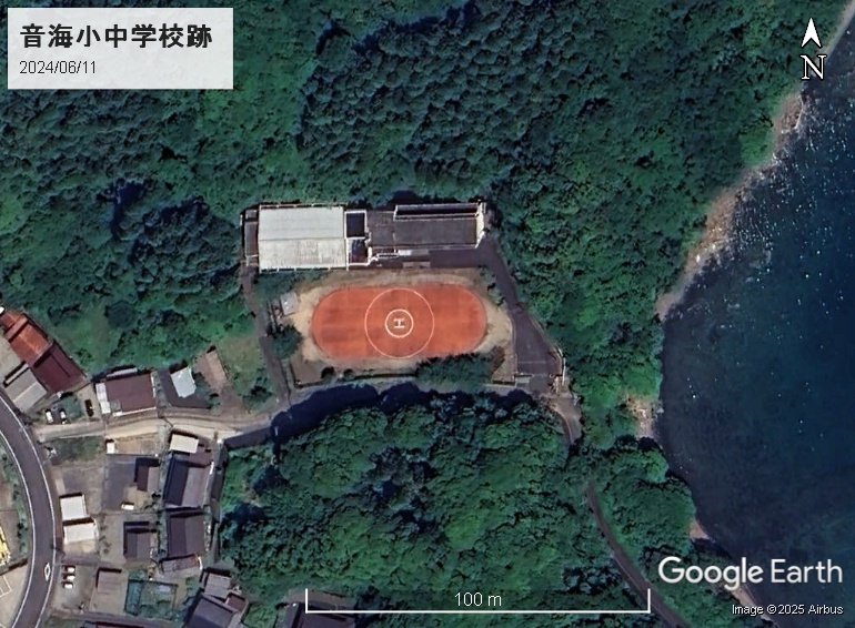 緑マーカーは音海小中学校の跡地です。ここもヘリポートとして整備されています。