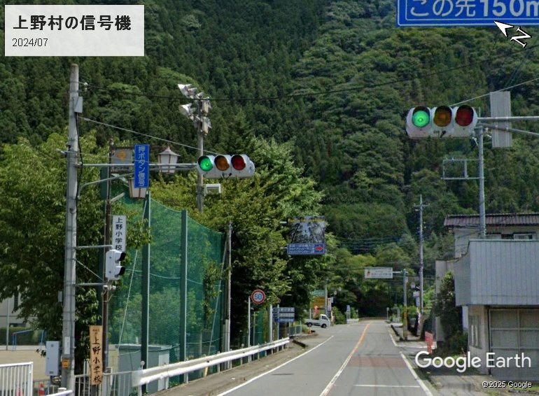 村内に1組だけ設置されているという信号機です(押しボタン式)。見通しが悪いわけではなく、交通量が多いわけでもなく、まして交差点でもありませんが、村立上野小前に設置されています。離島ではありがちなパターンです。
