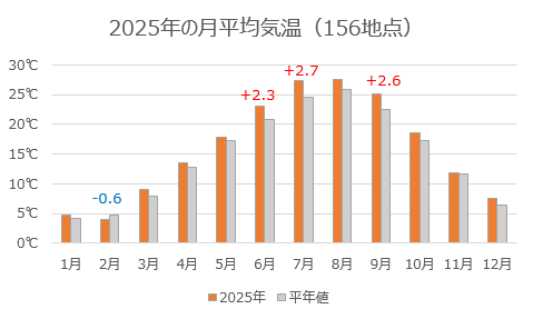 この結果、2025年は2月以外で平年値を上回っています。2℃以上の差がついたのは6月、7月、9月です。7月の平均気温は8月の平年値を超え、9月の平均気温は7月の平年値を超えています。