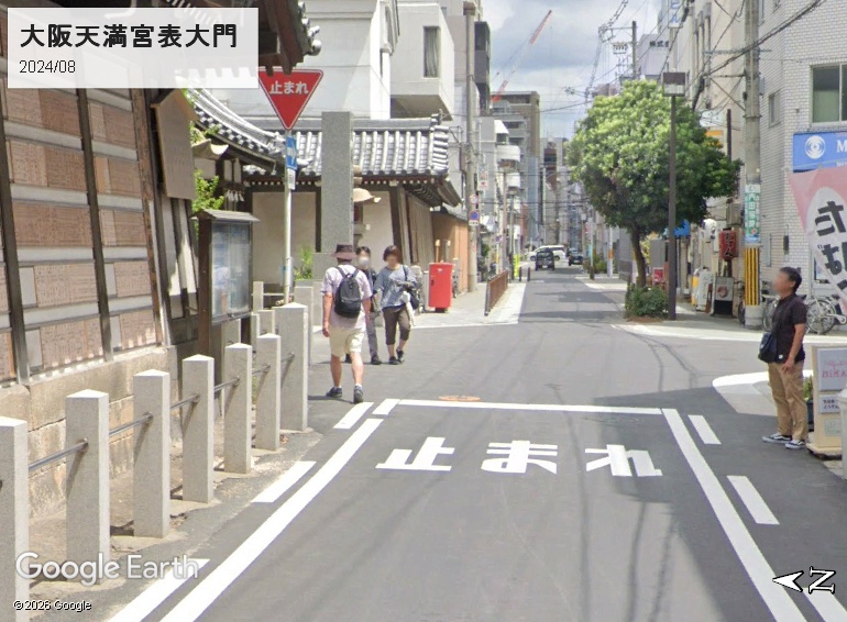 面白かったのが大阪天満宮の南側にある「表門筋」と称される東西道路です。2024年8月のストビューでは「止まれ」の横書き東京タイプですが、最古2010年2月のストビューでも東京タイプです。