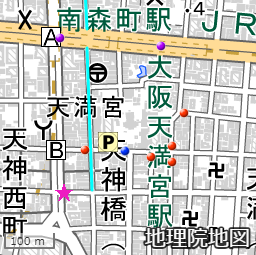地図の赤マーカーは縦標示の「止まれ」、青マーカーが横標示「止まれ」です。大阪天満宮の公式サイトでは、車でのアクセス方法として、南森町交差点(A)から南進、2つ目の信号を左折(B)、直進約100mで駐車場入口(P)と案内されています。