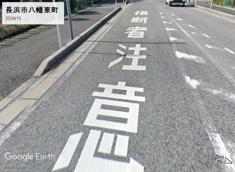 長浜市八幡東町の「横断者注意」の路面標示でもタテ線とヨコ線の間の空白は設けられていません。