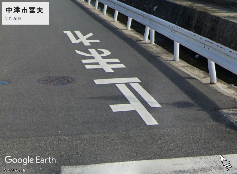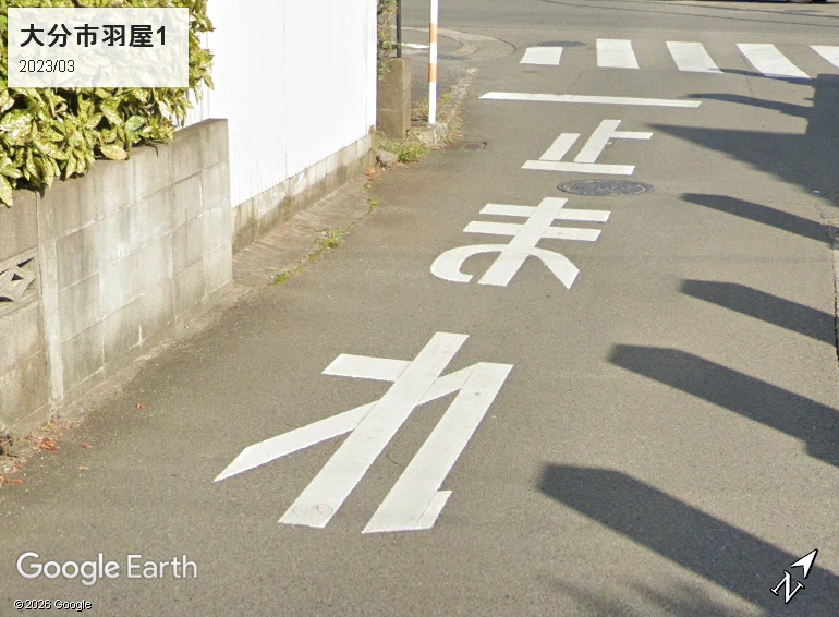 大分県の「止まれ」路面標示は「ま」の左下で縦棒と曲線の間に隙間があります。