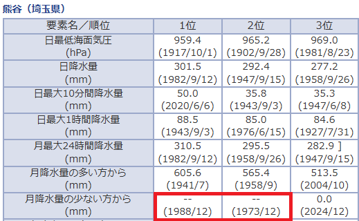 先月の御前崎特別地域気象観測所は降水量が「0.0」ミリではなく「–」でした。熊谷地方気象台では1973年12月と1988年12月に月間「–」ミリがあります。