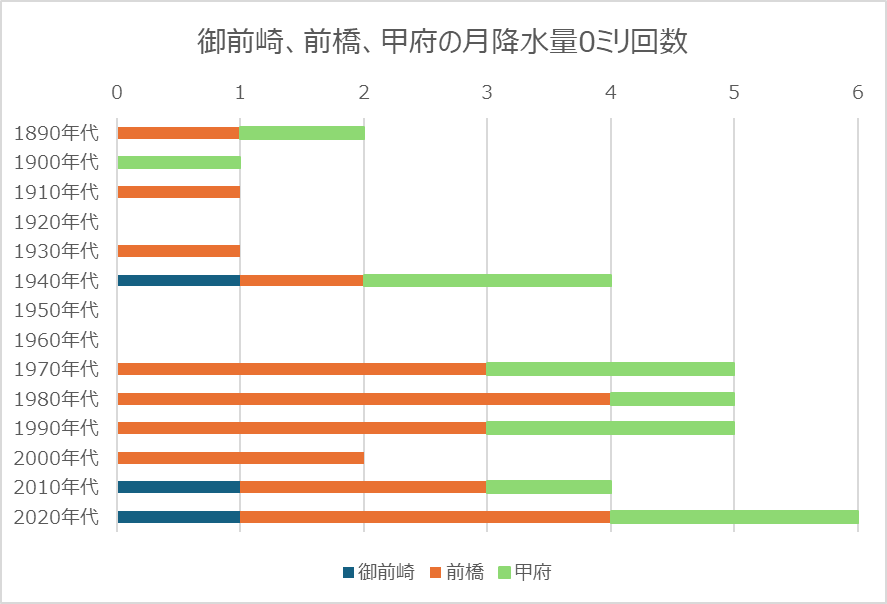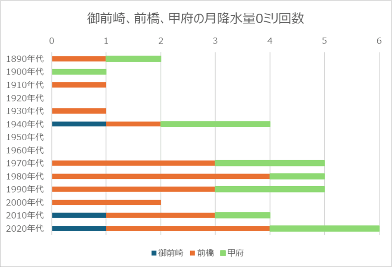 だとすると価値のある試みかもしれません。先月、いわゆる気象官署では御前崎など25地点で降水量0ミリでした。京都や神戸は初めての0ミリでしたが、前橋は21回目、甲府は12回目です。