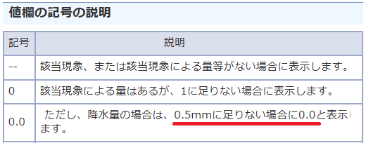 ハイフン2つ(「–」)は純粋なゼロですが、降水量の「0.0」は0.5ミリ未満を意味します。