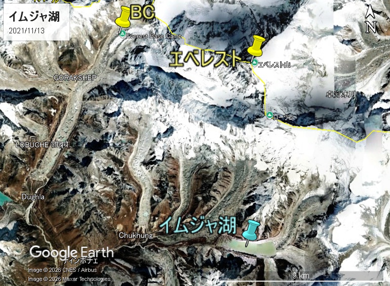 1月16日放映の「100年天気予報」でネパールのイムジャ湖が取り上げらました。番組では触れられませんでしたが、イムジャ湖は意外なほどエベレスト山頂に近く水平直線距離で約10キロほどです。イムジャ湖の標高は5030mとされていますので、エベレストとの標高差は約3800mです。