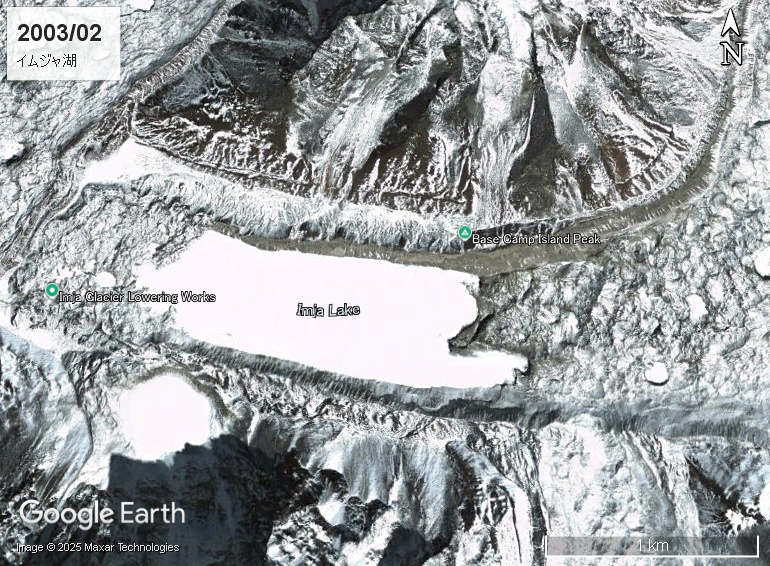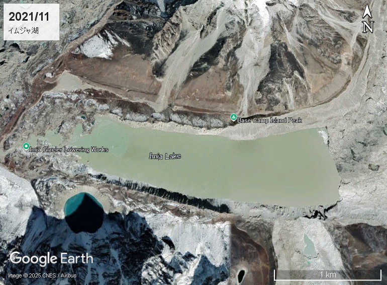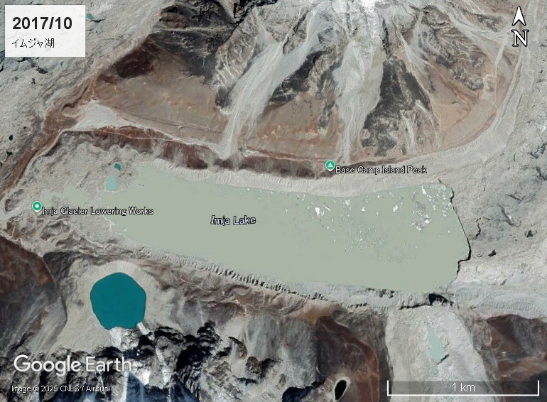 このイムジャ湖は氷河が溶けることで湖が形成された氷河湖です。湖になる前は氷河として微々たるものだとしても前進して(下って)おり、その先端ではどこかの川の源流になっていたはずです。