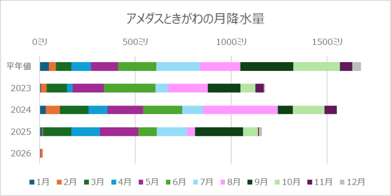 アメダスときがわの月降水量は去年の1月2月が18.5ミリ、今年は2/19まで17.5ミリです。驚くほど少ないわけでもありません。