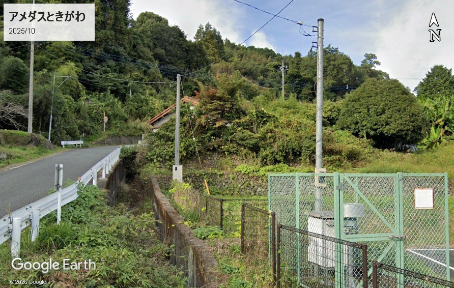アメダスときがわは町役場から8キロ以上離れた山間部ですが、雨量計自体はフェンス内に格納されており、別に特徴的ではありません。右の看板は「指定避難所」、左が「土石流危険渓流」です。