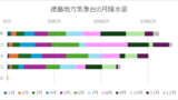 今回は福岡県と大分県の39観測所を集約しました。次表第2列の「統計開始」は月半ばからの観測開始のけースを含みます。第3列も同様です。第4列「未満」は月降水量1ミリ未満の月数、第5列「率」はその割合、第6列「直近」と第7列「その前」は月降水量1ミリ未満だった年月です。